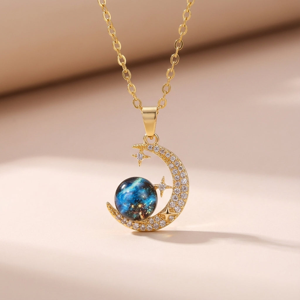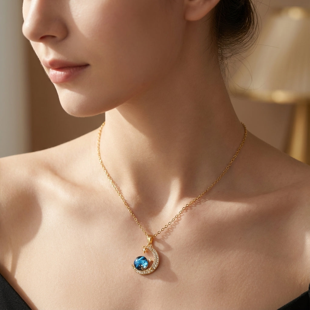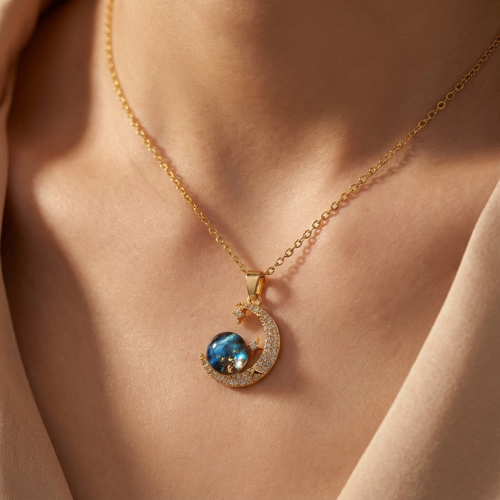 Le Pendentif Astralis associe une lune dorée sertie et une sphère bleutée inspirée des nuances galactiques pour créer une pièce élégante et expressive. Vous profitez d’un bijou léger, durable et pensé pour accompagner vos tenues avec finesse.