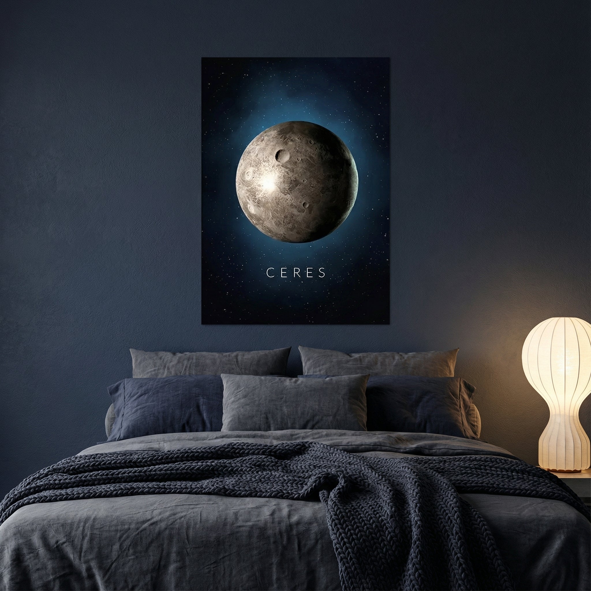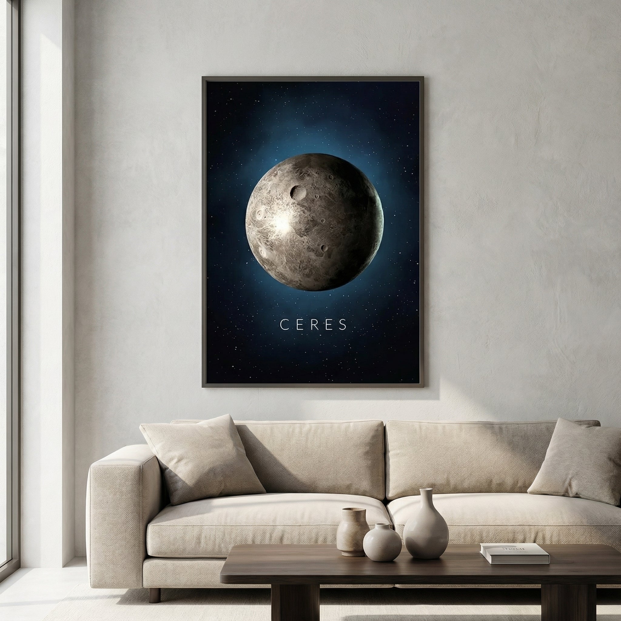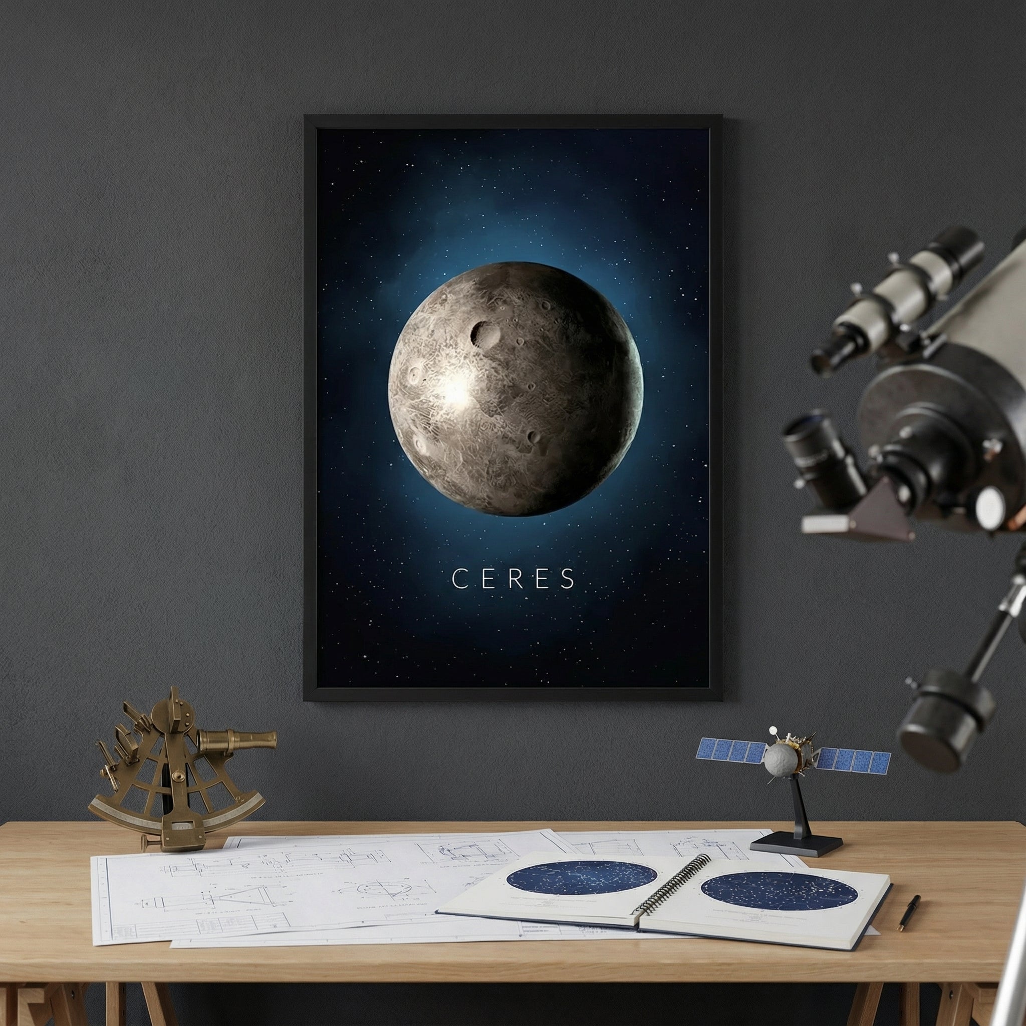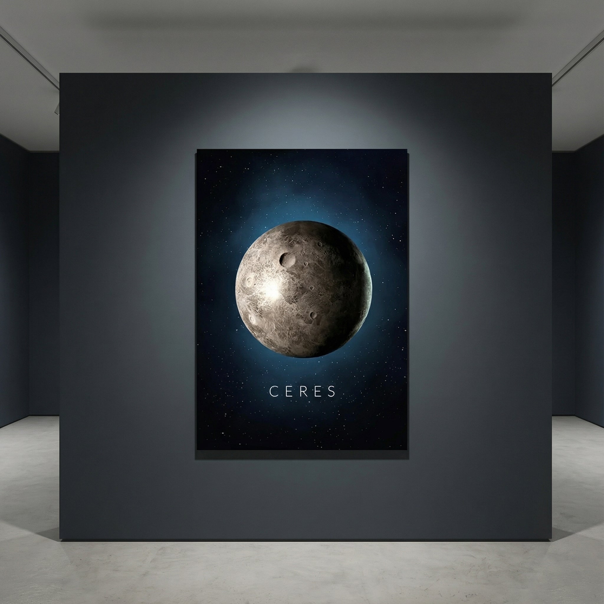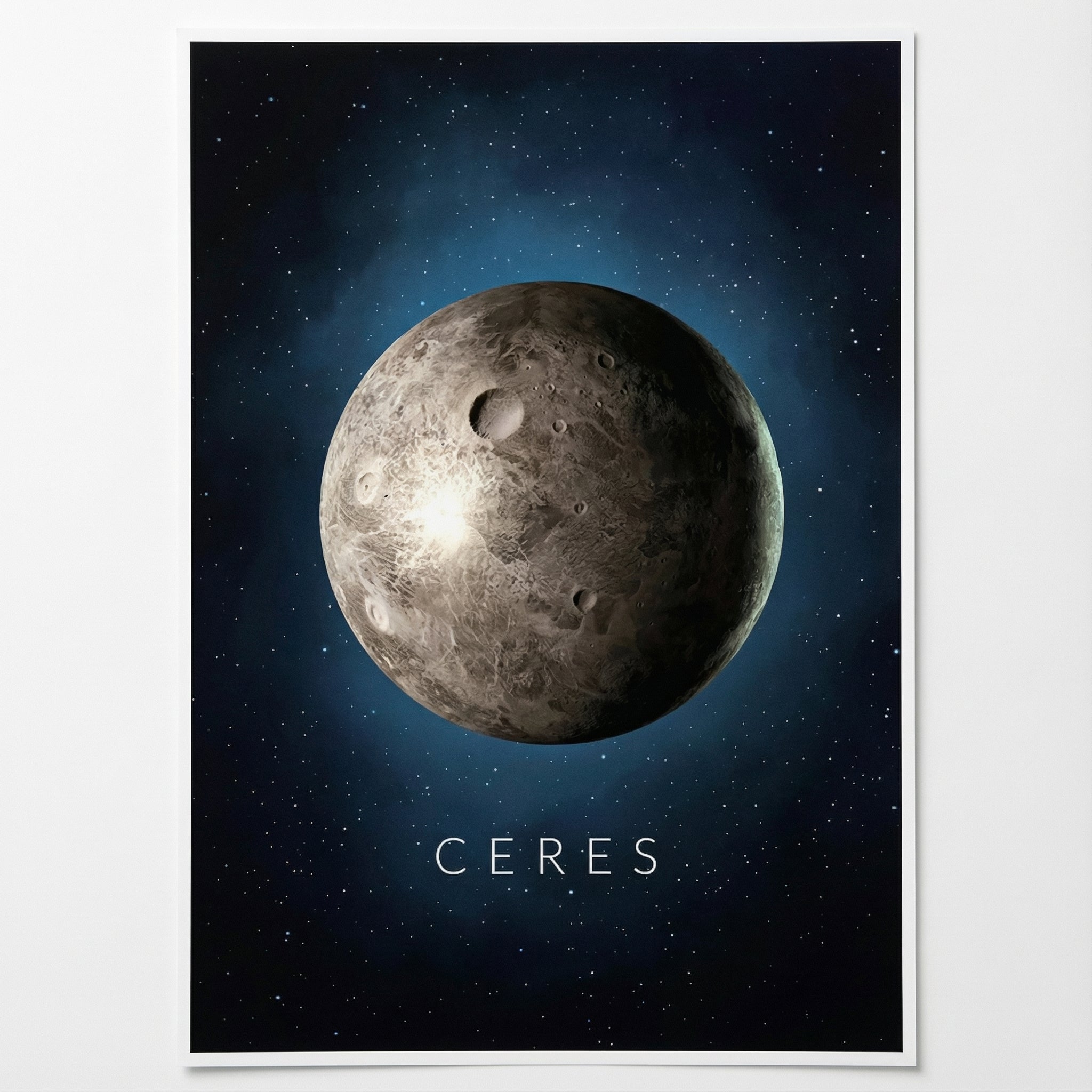 Notre Poster Ceres (Lune de Jupiter) met en scène la surface rocailleuse et marquée de ce monde nain, révélant ses cratères avec une précision qui lui donne un caractère presque sculptural. Son halo bleu sombre crée un contraste subtil, idéal pour apporter une touche scientifique et raffinée dans un salon, une chambre ou un espace de travail.