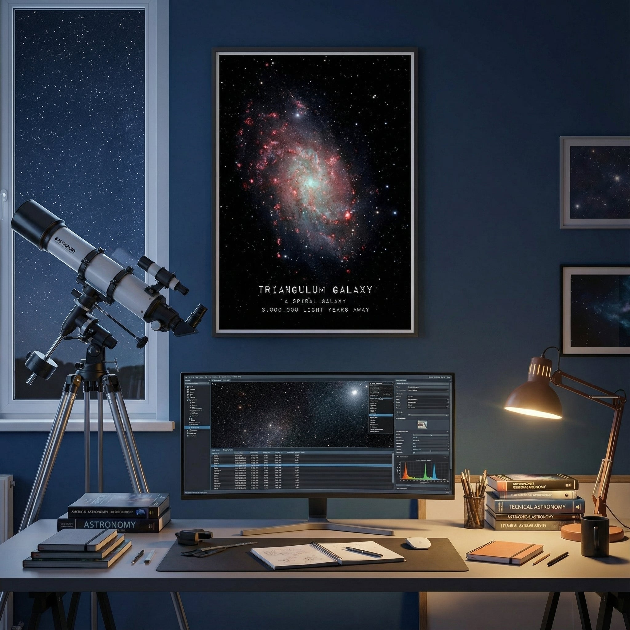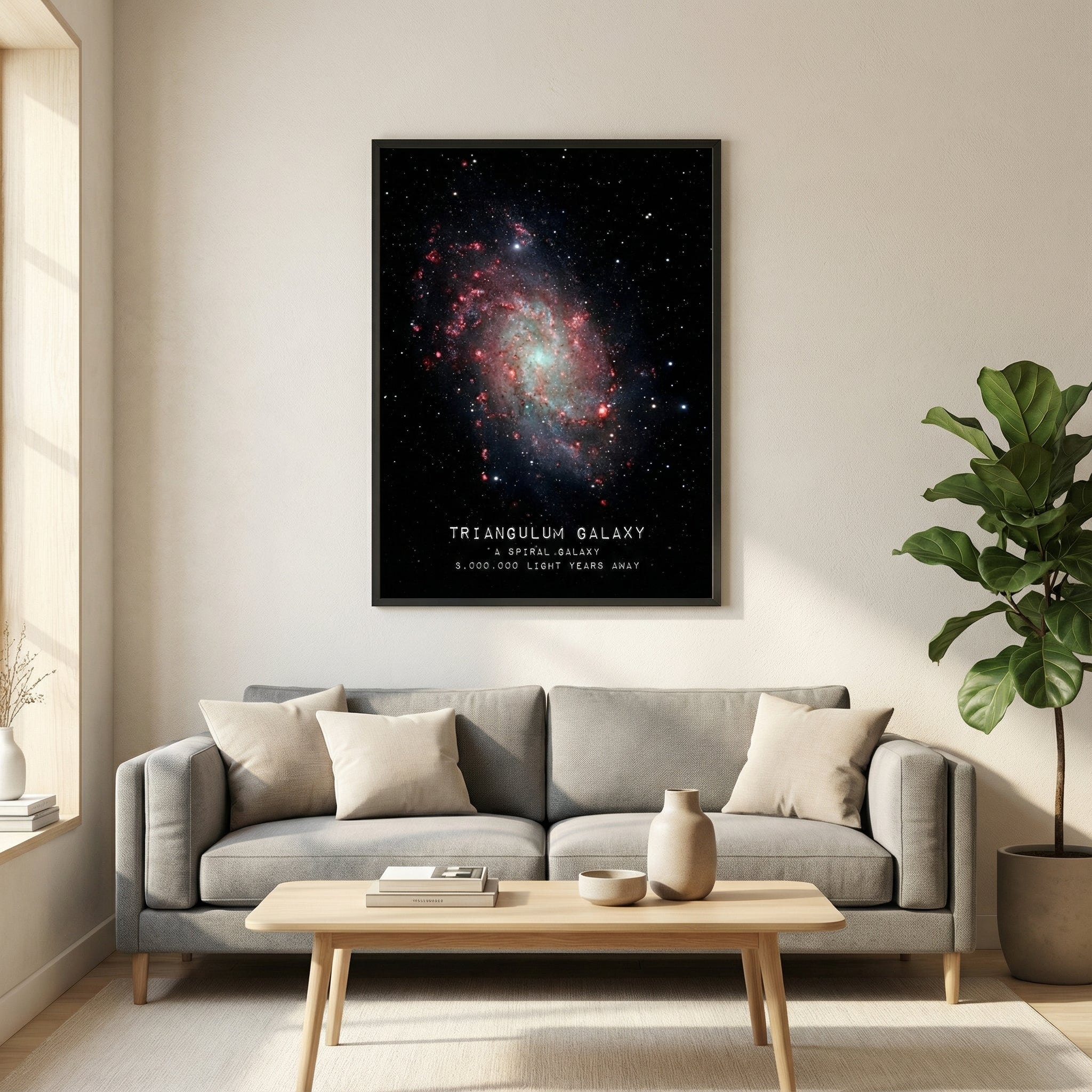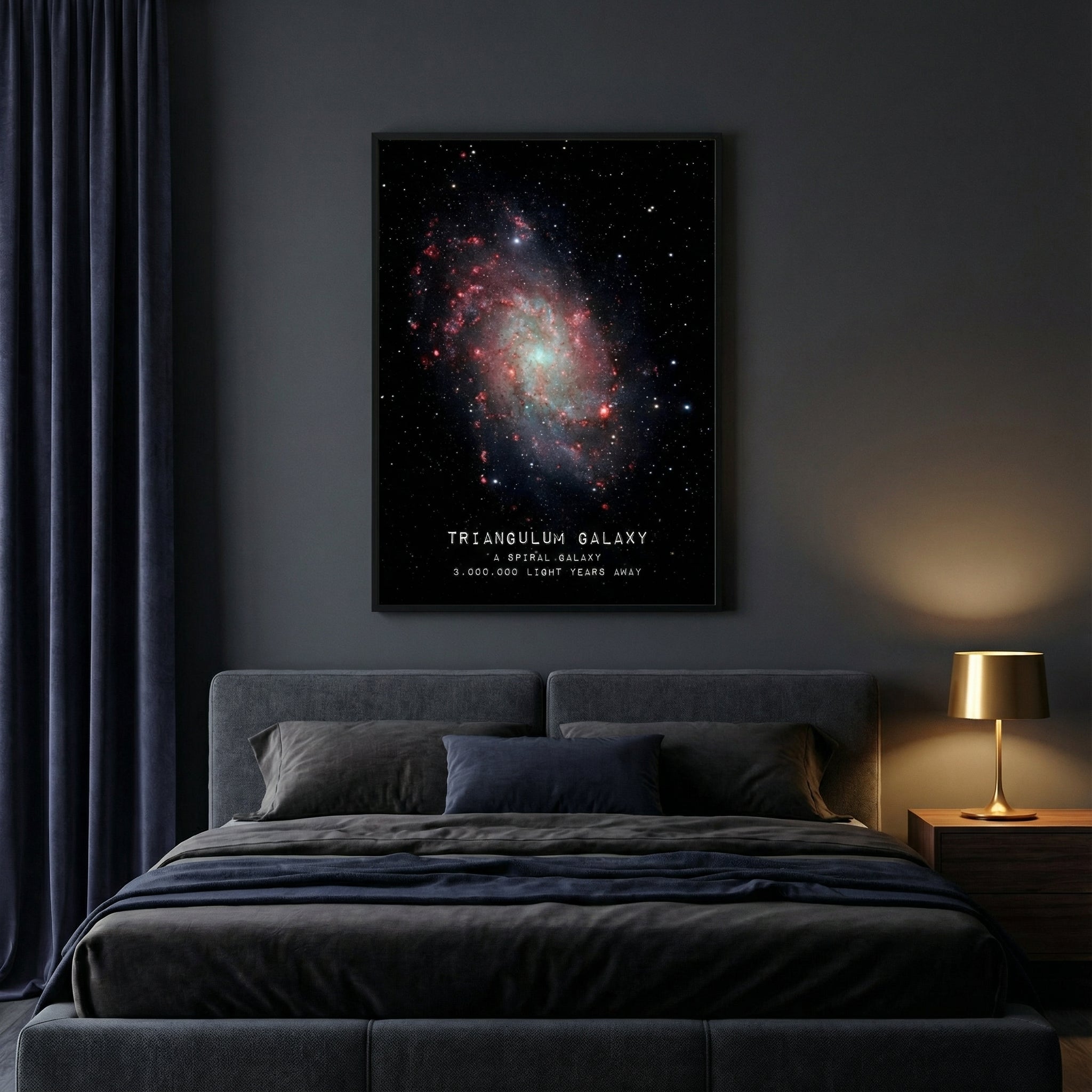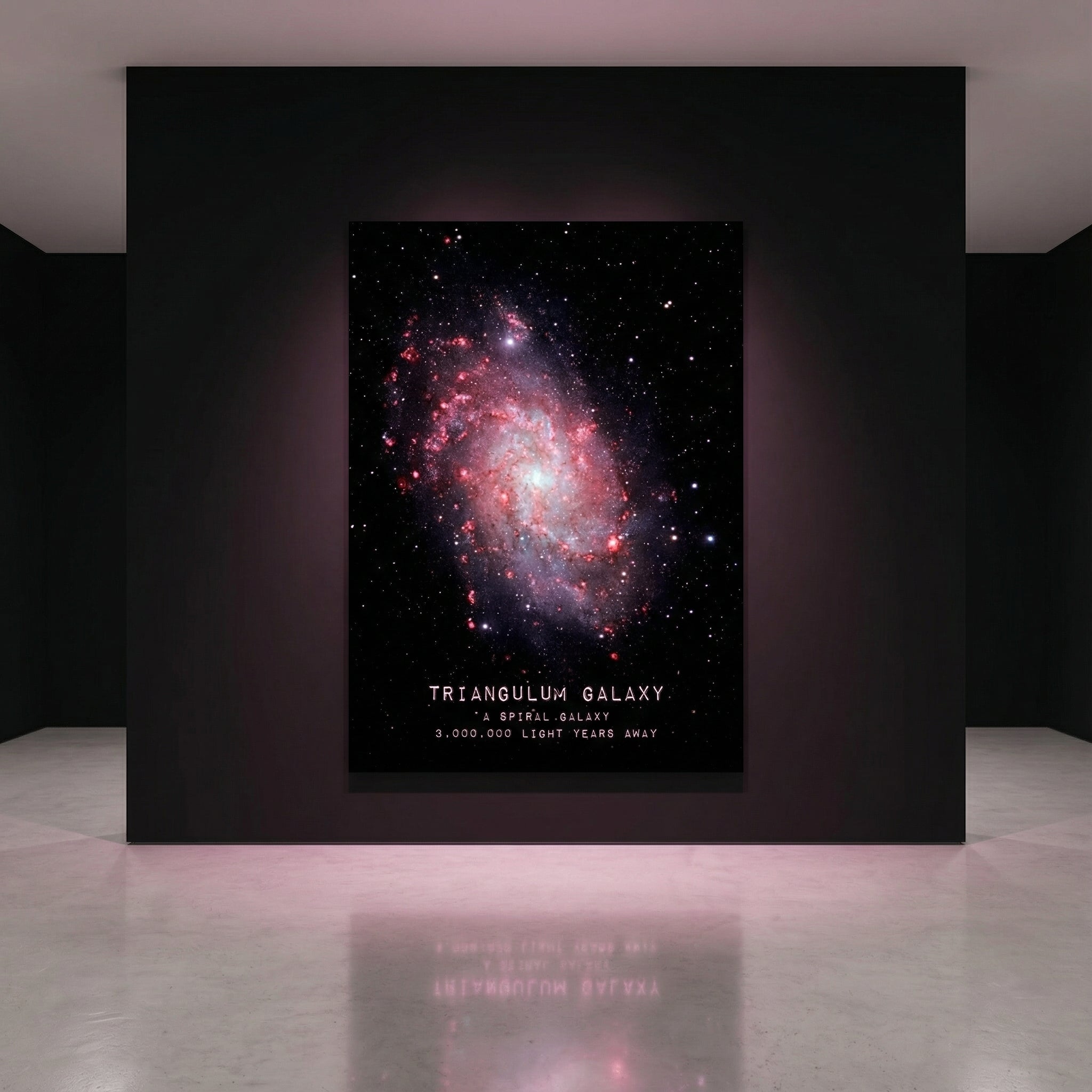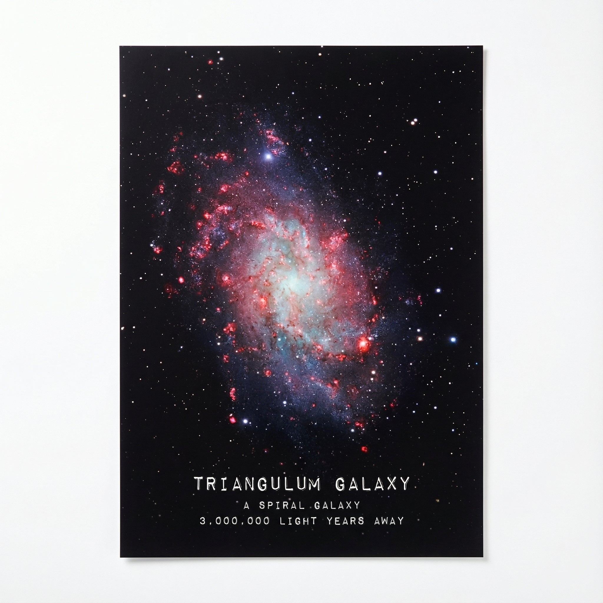 Notre Poster Triangulum met en valeur la finesse et la complexité de cette galaxie spirale, dont les zones rosées et lumineuses contrastent avec l’obscurité profonde du fond stellaire. Ce rendu riche et détaillé apporte une présence visuelle forte, idéale pour donner du caractère à un salon, un bureau ou une chambre passionnée d’astronomie.